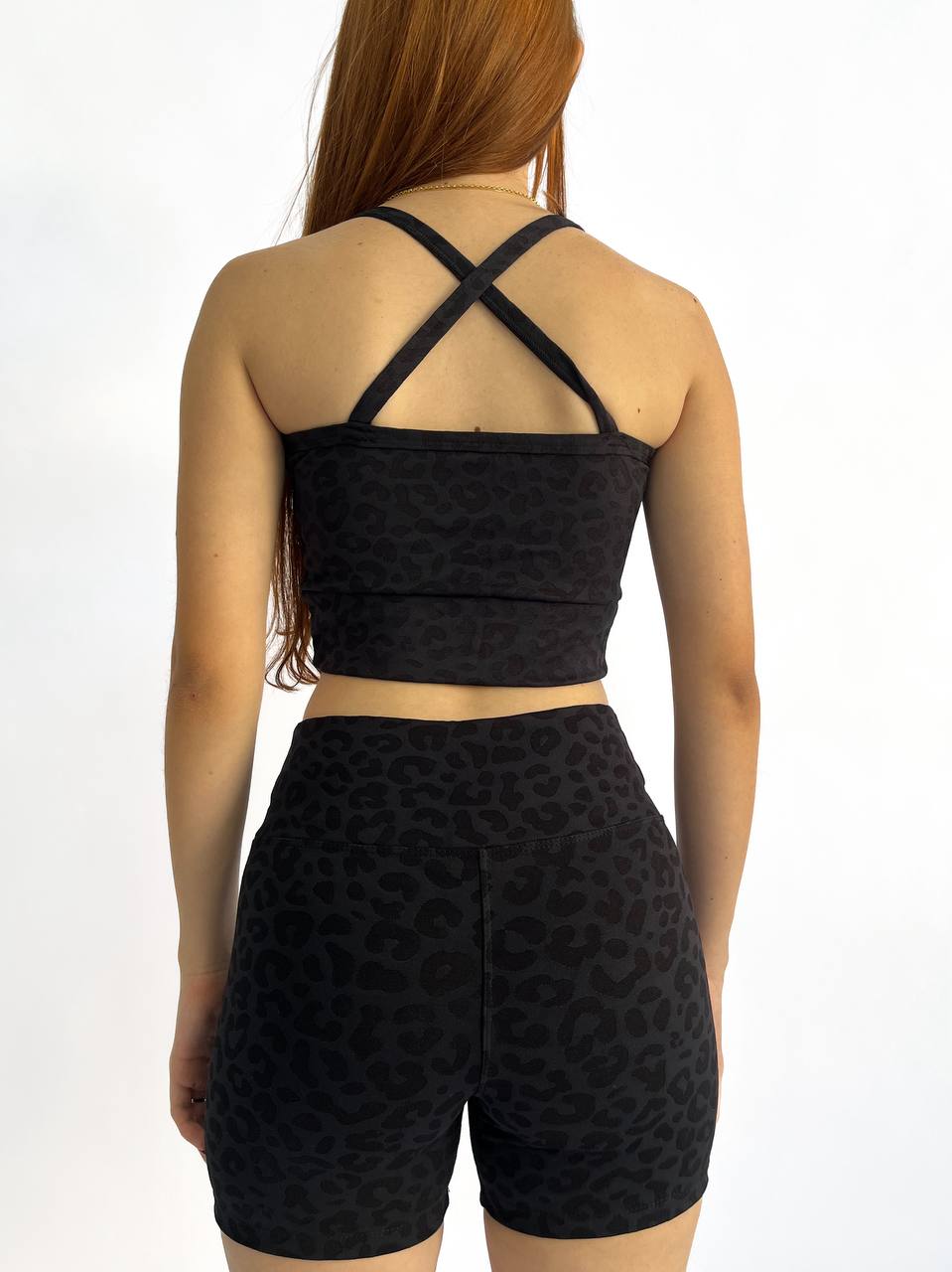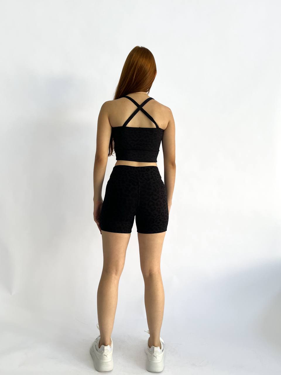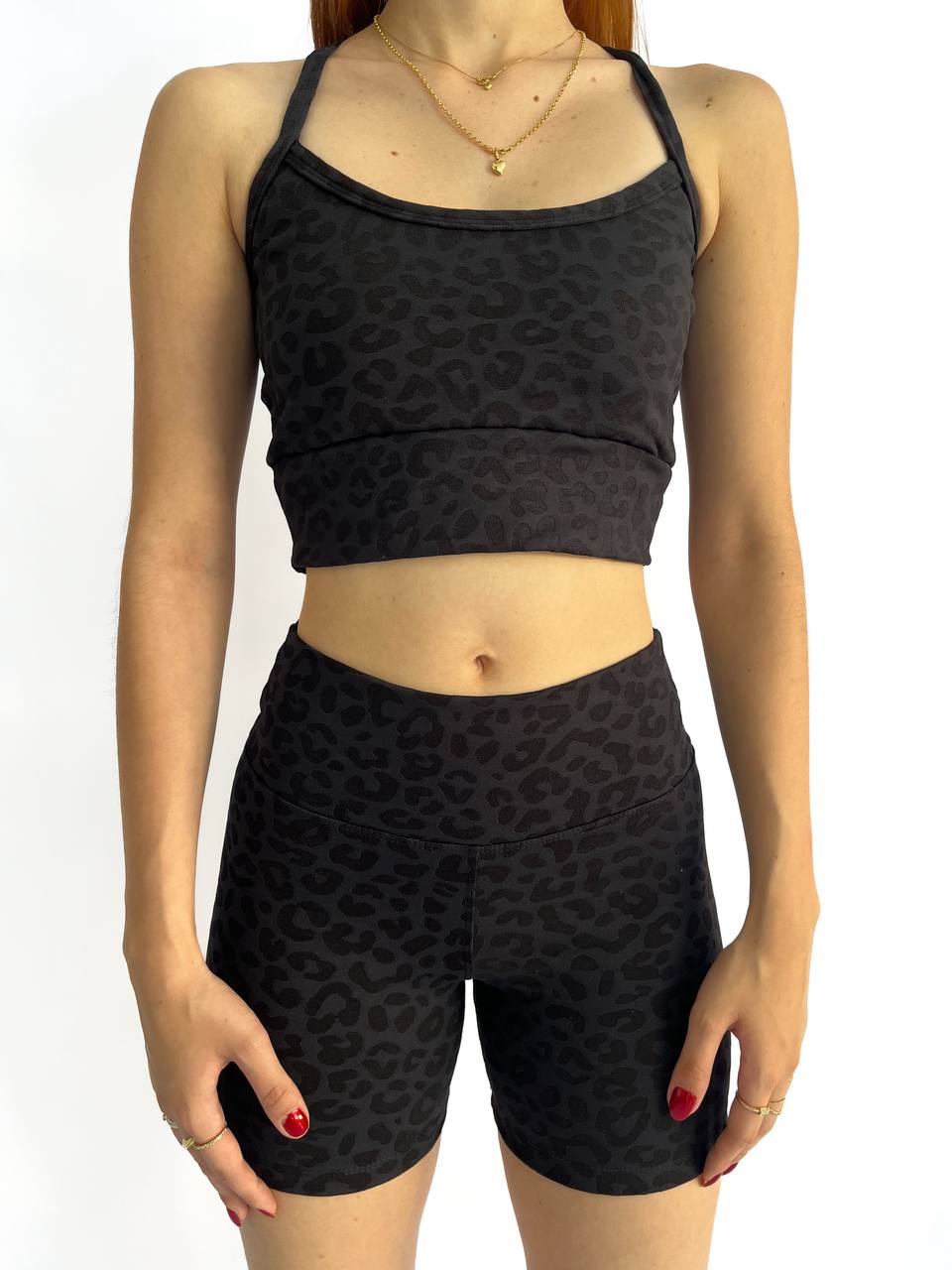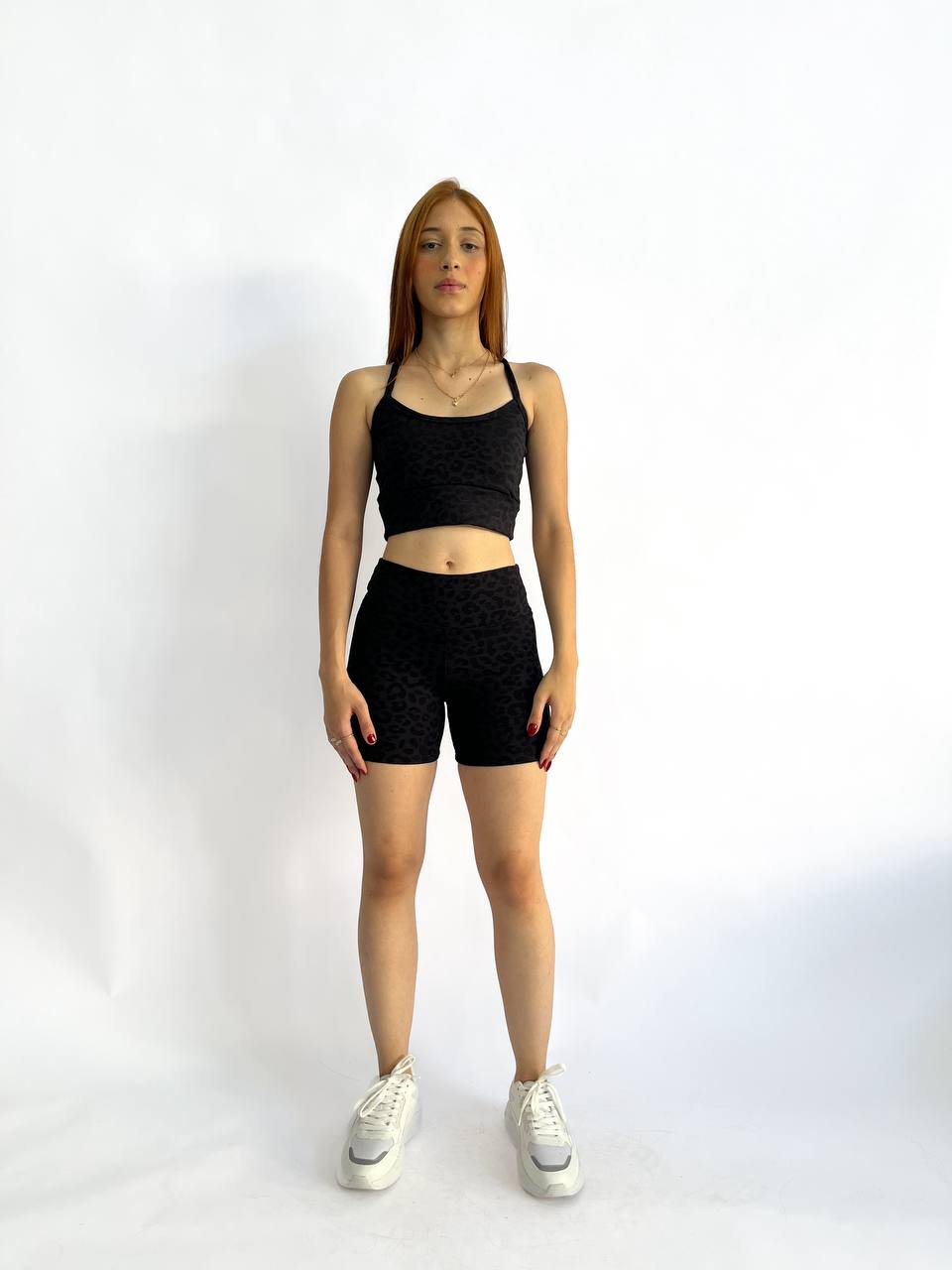 Este duo de treino é composto por um Top Cropped e um Short de Cintura Alta, ambos confeccionados em tecido de alta compressão na cor preta, apresentando uma sutil e elegante estampa de onça (leopard print) em relevo fosco.